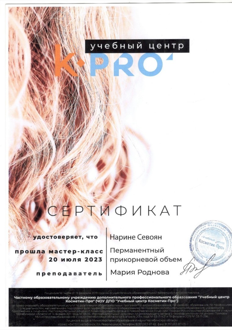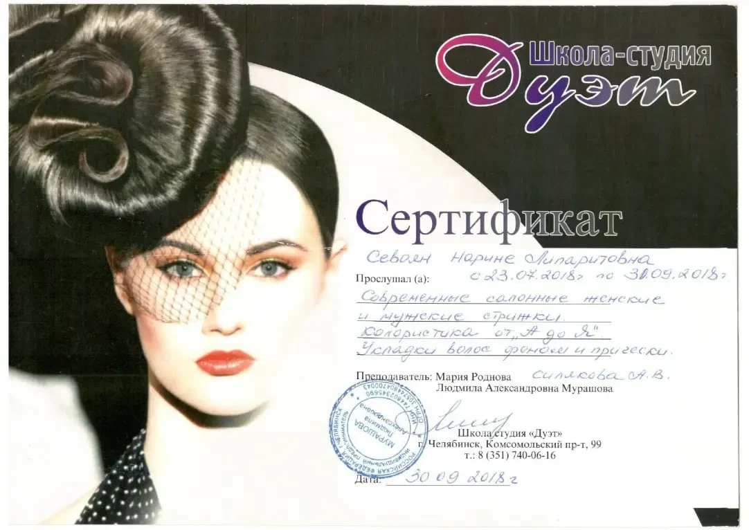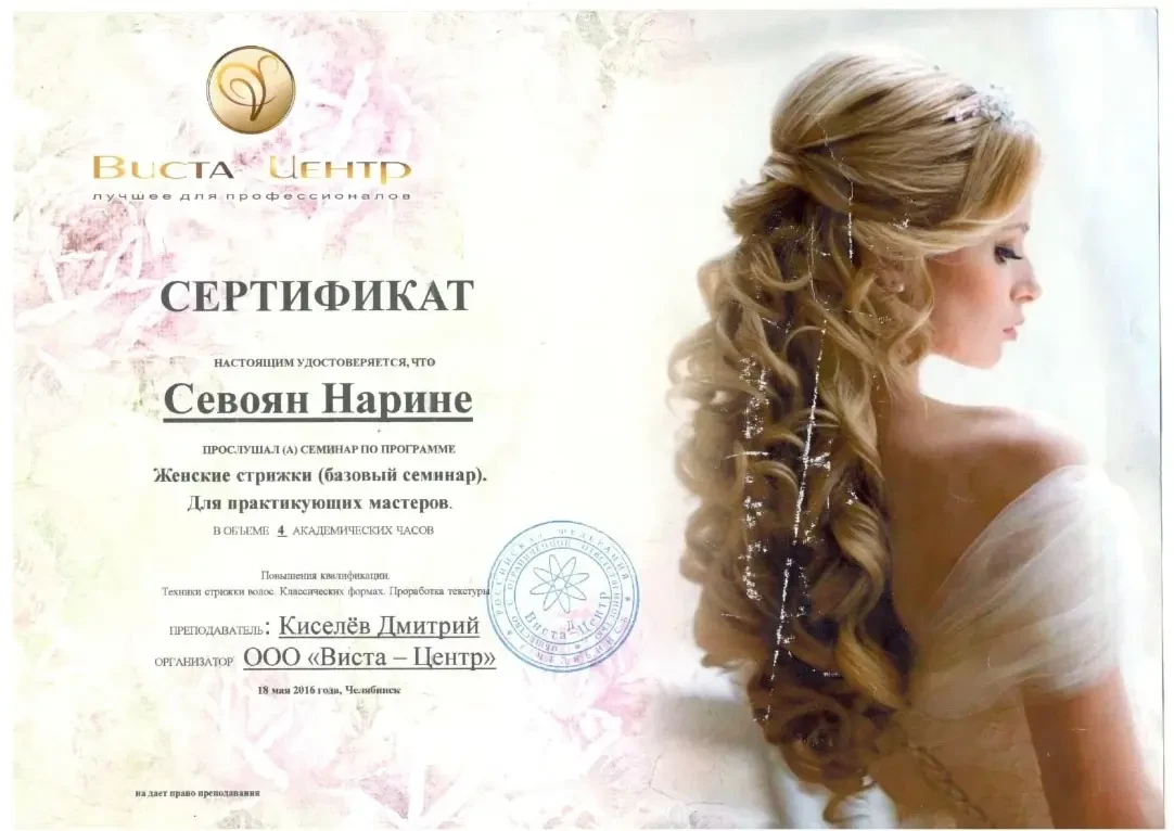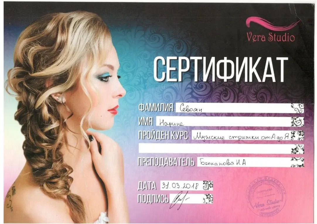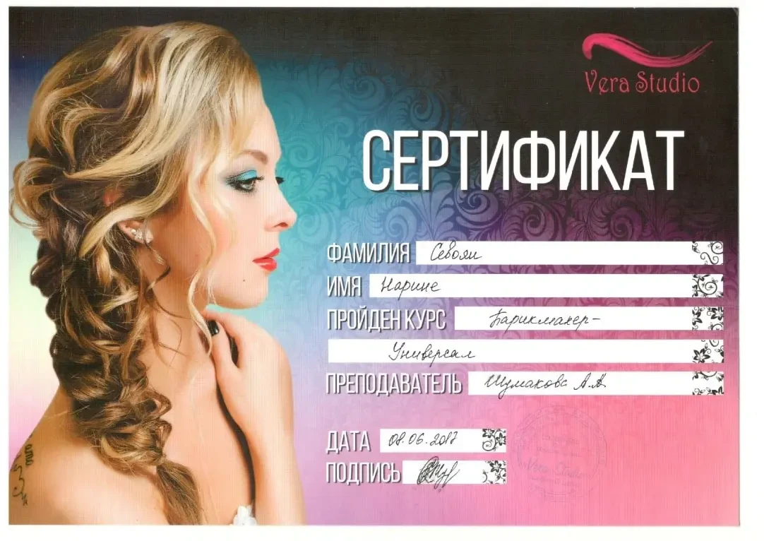 Свой профессиональный путь Нарине начала в 2014 году, окончив курсы подготовки в учебном центре «Vera Studio»